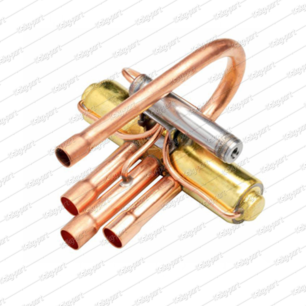 The 4-way reverse valve is a mounting piece used in air conditioner assemblies.